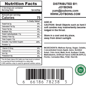 Ingredients: Glucose Syrup, Sugar, Gelatin, Glucose, Concentrated Apple Juice, Pectin, Agar, Carrageenan, Citric Acid Monohydrate, Artificial Flavor (APPLE), Malic Acid, Vegetable Oil, Potassium Chloride, Sodium Citrate, Titanium Dioxide, Carnauba Wax, FD&C Green 3