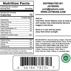 Ingredients: Glucose Syrup, Sugar, Gelatin, Glucose, Concentrated Watermelon Juice, Pectin, Agar, Carrageenan, Citric Acid Monohydrate, Artificial Flavor (WATERMELON), Malic Acid, Vegetable Oil, Potassium Chloride, Sodium Citrate, Titanium Dioxide, Carnauba Wax, FD&C Red 40